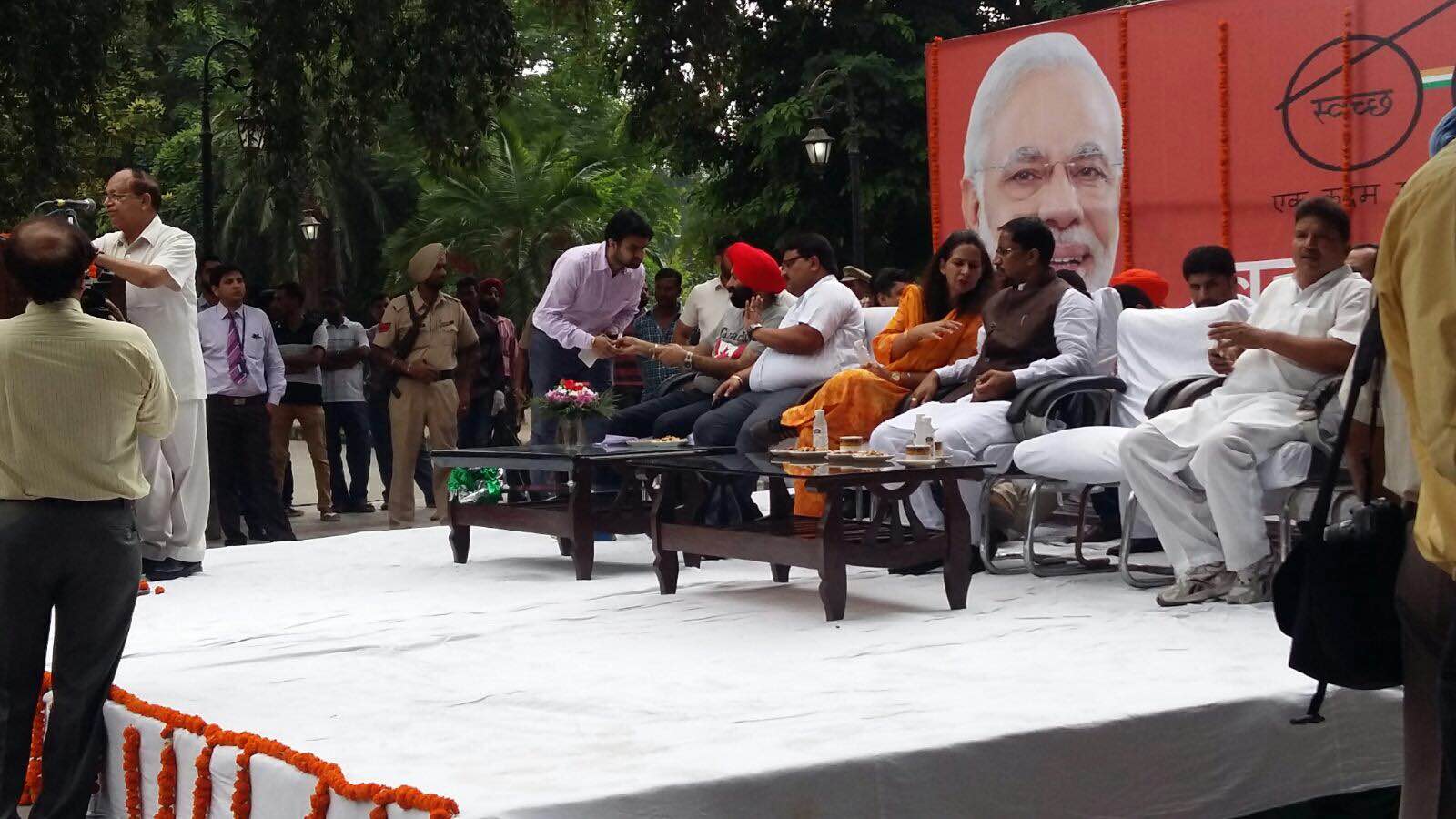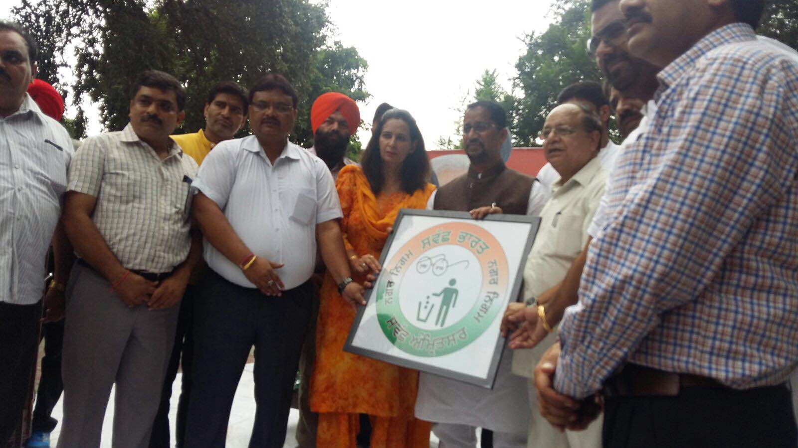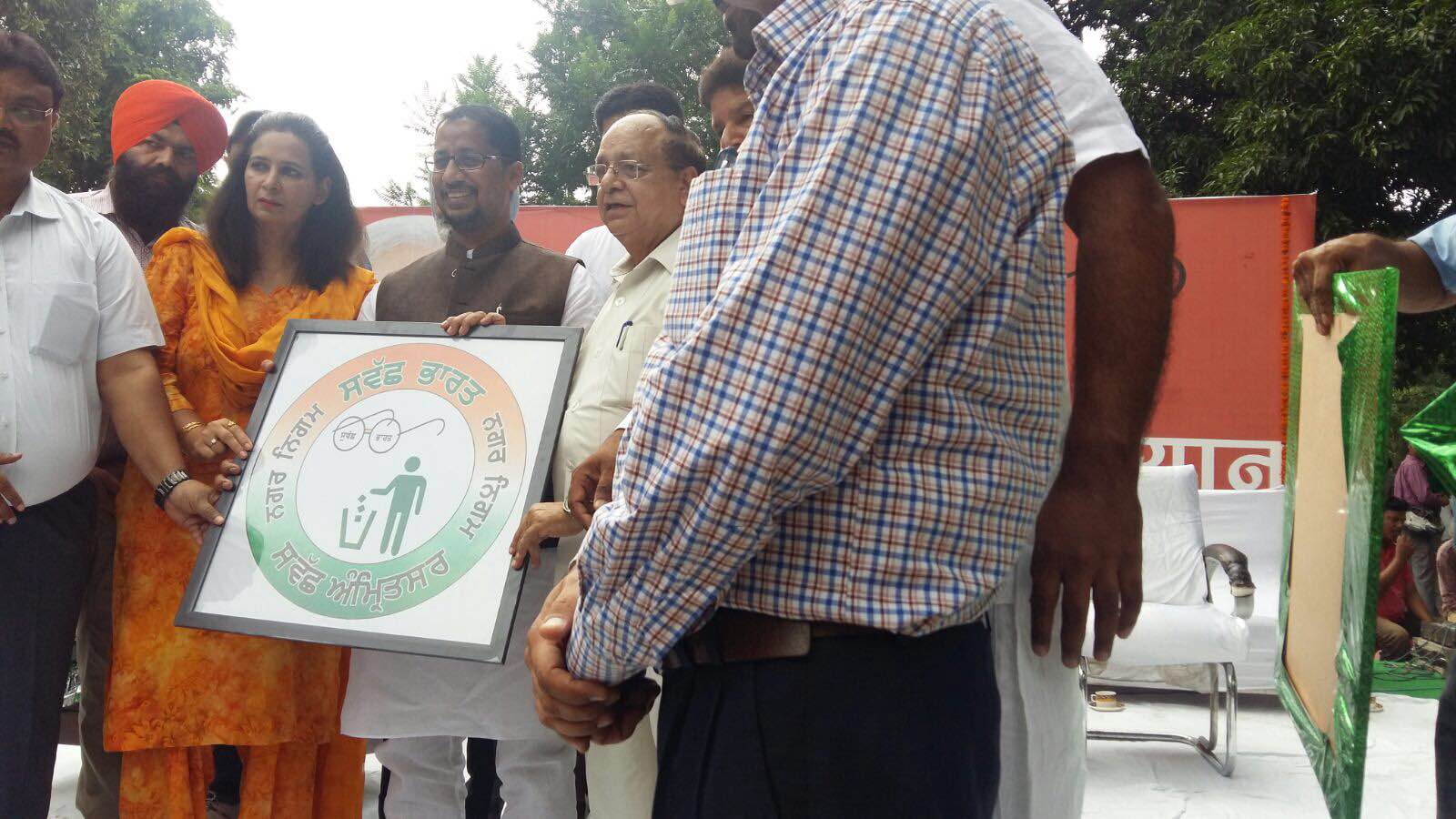 Honorable Sh. Anil Joshi Ji, Local Government Minister and Medical Education and Research Minister, Punjab releases a Logo of Swachh Bharat Swachh Amritsar Mission on the eve of Nation wide Sanitation/Cleanliness Compaign Program along with Sh. Bakshi Ram Arora, Mayor, Municipal Corporation, Amritsar, Mrs. Navjot Kaur Sidhu, Chief Parliamentary Secretary and Sh. Pardeep Sabharwal, I.A.S., Commissioner, Municipal Corporation, Amritsar at a Public Gathering organized at Ram Bagh, Amritsar.